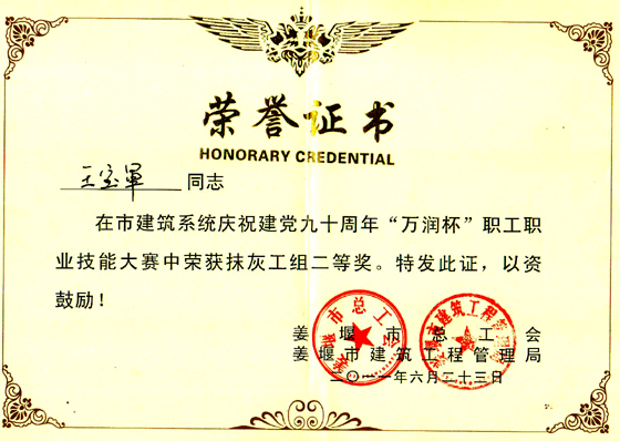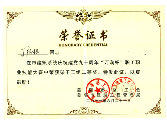近日,在由姜堰市總工會、姜堰市建筑工程管理局、中國建筑工會姜堰市委員會、姜堰市建筑行業(yè)協(xié)會組織的全市建筑系統(tǒng)開展慶祝建黨90周年“萬潤杯”職工職業(yè)技能大賽中,我集團公司李煥寶項目部架子工丁虎根、儲桂華項目部抹灰工王寶軍分獲大賽二等獎。