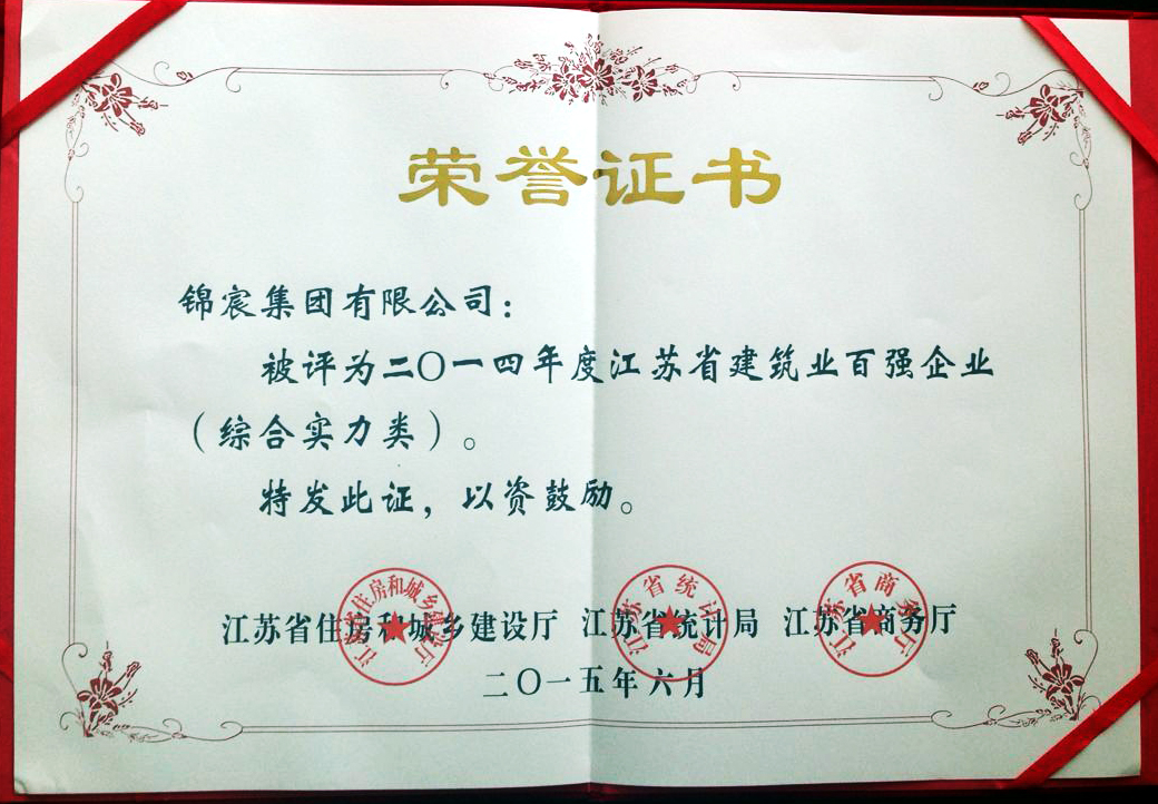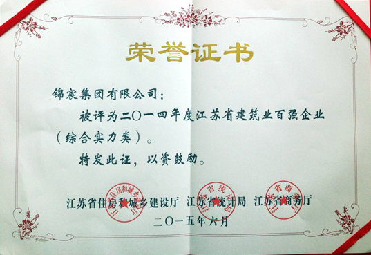 6月11日,江蘇省政府召開(kāi)建筑業(yè)創(chuàng)新發(fā)展暨2014年度“百?gòu)?qiáng)企業(yè)”發(fā)布會(huì),會(huì)議回顧總結(jié)了2014年全省建筑業(yè)發(fā)展工作,發(fā)布2014年度全省建筑業(yè)“百?gòu)?qiáng)企業(yè)”名單,部署推進(jìn)建筑業(yè)創(chuàng)新發(fā)展,并向受表彰的全省建筑業(yè)綜合實(shí)力、建筑裝飾裝修、建筑鋼結(jié)構(gòu)、建筑安裝、基礎(chǔ)設(shè)施、建筑外經(jīng)六大類(lèi)共100家企業(yè)頒發(fā)了獎(jiǎng)牌。錦宸集團(tuán)榜上有名。