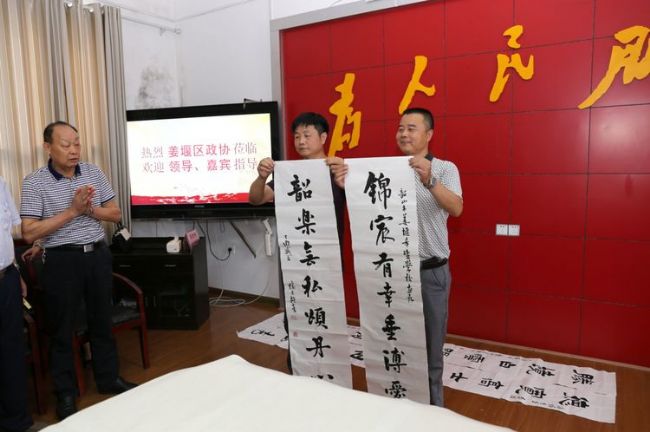 會(huì)后,隨團(tuán)前來的區(qū)藝術(shù)家向?qū)W校贈(zèng)送書畫作品,區(qū)書法家協(xié)會(huì)主席郁勝天現(xiàn)場(chǎng)揮毫潑墨寫下了“錦宸有幸垂博愛,韶樂無私頌丹心”。